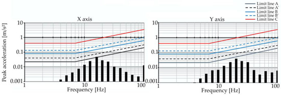 Graph of the maximum vibration accelerations of the central frequencies 1/3 octave with the limit lines of the standard [37].