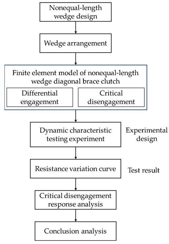 The rest of the paper is organized as follows: Section 2 introduces the working principle of the slant support clutch and studies the main contents and methods of the design of unequal wedge blocks. Section 3 details the design of various wedge layouts and analyzes the differential engagement dynamic characteristics of the clutch. Section 4 studies the response of the clutch in a critical disengagement state. Section 5 verifies the effectiveness of the model through critical detachment experiments. The total research flowchart of this article is shown in Figure 1.