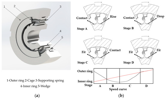 Figure 2a shows a 3D view of the sprag clutch. When a centrifugal-disengagement diagonal brace clutch is in the outer-ring overrun state, the wedge is subjected to the centrifugal moment generated by the centrifugal force under the non-inertial reference frame, and the inner ring and wedge tend to separate. As the rotational speed of the outer ring increases, the wedge completely detaches from the inner ring. When the differential engagement of the slow coupling clutch is made, the theoretical engagement process starts from the clutch part of the wedge contacting the inner and outer rings at the same time and ends with the complete torque transmission of the clutch; the entire differential engagement process is displayed in Figure 2b. Stage A: the clutch starts differential engagement; Stage B: the inner ring speed increases, the outer ring speed decreases, and the difference between the inner and outer ring speeds causes the clutch part of the wedge to experience engagement conditions; Stage C: part of the wedge is engaged, which can transmit a small torque between the inner and outer rings, and the speed of the outer ring continues to decrease such that other wedges contact the inner ring and produce joint conditions; and Stage D: the diagonal clutch is fully engaged.