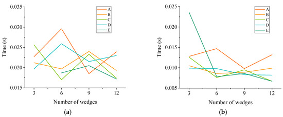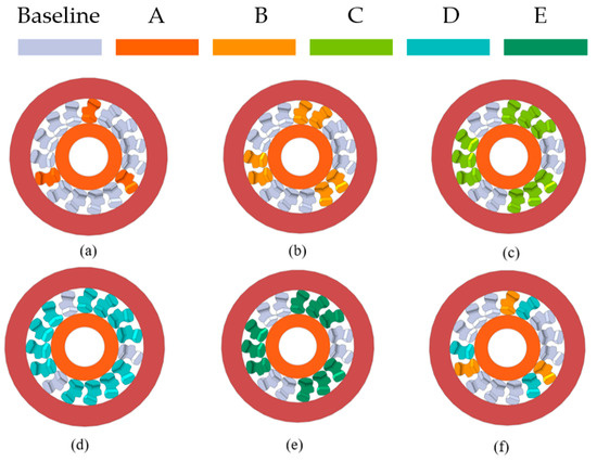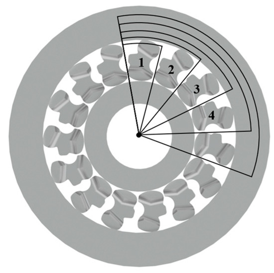 Based on a certain type of conventional clutch, the number of wedges was set to 15. A multibody dynamics simulation was performed by changing the number of wedges, and the influence of the number of wedges on the differential engagement characteristics of the clutch was obtained. Two different wedges were combined and arranged to design the model of an unequal-length wedge-inclined supported clutch. As indicated in Figure 4, the 15 wedges were divided evenly into three parts, and the wedges in each part were arranged in the same manner. Taking one of the sectors as an example, we could obtain 20 different ways of arranging the wedges by replacing the wedges in the small sectors numbered 1–4 with Wedges A–E; that is, 20 models of unequal-length wedge clutches were designed.