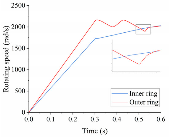 - Approximately 0.1 s after the speed of the clutch outer ring is withdrawn, the speed of the inner and outer rings remains the same. During this period, the speed decrease rate of the outer ring of the clutch remains constant until 0.526 s. At this point, the wedge is completely detached from the inner ring until the speed of the outer ring decreases to approximately 1900 rad/s and the bonding conditions are re-established.