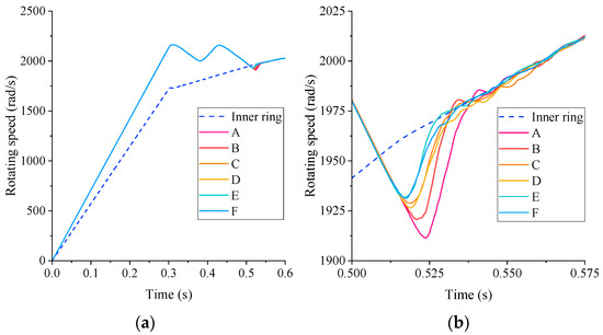 The differential engagement dynamic model of the unequal-length wedge slant support clutch can be solved, and the time-domain diagram of the differential engagement inner and outer ring speed curves can be obtained, as displayed in Figure 8, A–F corresponds to different wedge arrangement schemes in Figure 6. Except for the slant support clutch with the A wedge, the engagement response duration of all other ”slow contact” clutches was extended; that is, the speed of the outer ring dropped freely first. When the speed was consistent with that of the inner ring, certain wedges were engaged to transmit torque, delaying the rate of decline of the outer ring speed. The remaining wedges were then engaged, and the speeds of the inner and outer rings remained consistent.