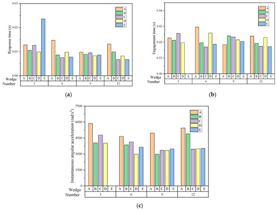 The differential engagement performance of the slanted support clutch with unequal-length wedges was comprehensively evaluated in terms of response time, engagement time, and instantaneous angular acceleration. Figure 9 shows the performance of the slanted support clutch with five wedges under different wedge numbers.