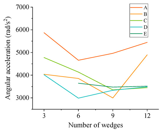 It can be observed from Figure 10 that except for the “slow connect” slant support clutch with three E wedges, which cannot transmit torque owing to an insufficient number of long wedges, the other unequal-length wedges arranged and combined function normally. A comparison of the data between the same type of wedges revealed that the response and engagement times of the clutch decreased as the number of wedges increased. By comparing the data of the different wedges, it was found that the response and engagement times of the clutch demonstrated a decreasing trend with an increase in the length of the middle section of the wedge. The relationship between the instantaneous angular acceleration of the clutch outer ring and number of wedges was analyzed, as displayed in Figure 11. It can be observed that as the number of wedges increased, instantaneous angular acceleration first decreased and then increased. Comparing the simulation results between different wedges, it can be observed that as the length of the middle section of the wedge increased, the instantaneous angular acceleration of the outer ring decreased. A further comparative analysis of the differences between clutches using different wedges is presented in Table 4.