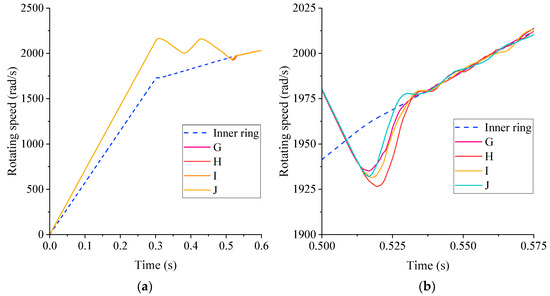 The analysis method for the differential engagement performance of the slanted support clutch with three groups of unequal-length wedges was the same as above. Four different wedge combination modes, G–J, respectively, were designed. The time-domain curves of the internal and external ring speeds displayed in Figure 12 were obtained through simulation; a comprehensive performance comparison is presented in Table 5.