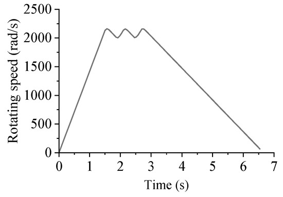 In the overrunning state of the slanted support clutch, friction occurs between the outer ring and wedge before it is fully disengaged. The wedge accelerates to rotate in the same direction under the force of the outer ring. With an increase in the speed, the centrifugal force of the wedge increases, and the wedge further compresses the outer ring. As the wedge gradually rises, the friction force with the inner ring gradually decreases and, finally, completely disengages from the inner ring. Therefore, by simulating and reading the moment when the contact force between the clutch wedge and inner ring is zero, it can be determined that the clutch wedge and inner ring have already disengaged. At this point, the instantaneous speed of the clutch exceeds the critical disengagement speed. Using the dynamic model in Section 3.1, with the outer ring of the clutch as the active component, the loading curve of the model is displayed in Figure 13.