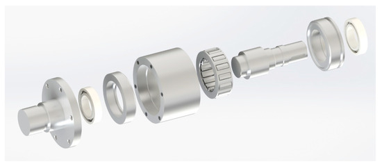 By comparing the data in Section 3.2 and Section 4.2, it can be observed that the differential engagement performance of the slanted support clutch with six E wedges was superior; therefore, the slanted support clutch was selected for the experiment. The unequal-length wedge slant support clutch was composed primarily of nine original wedges, six No. 5 wedges, a cage, the inner ring of the clutch, end caps on both sides, the outer ring of the clutch, two support springs, and two 6008 zirconia ceramic bearings. The explosion and physical diagrams of the wedge are displayed in Figure 14 and Figure 15, respectively.