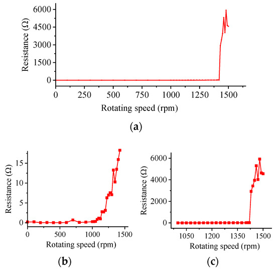 A DC resistance tester was connected to the inner and outer rings of the clutch using an electric brush. The resistance values between the inner and outer rings of the clutch were collected in real time; the sudden change range of the resistance values of the inner and outer rings of the clutch was further subdivided by the target speed of the outer ring of the clutch. Gradually, the load was increased in increments of 10 rpm, and the resistance values between the inner and outer rings were recorded at each speed. The relationship between the resistances of the inner and outer rings of the clutch and the speed of the outer ring was obtained experimentally, as indicated in Figure 16.