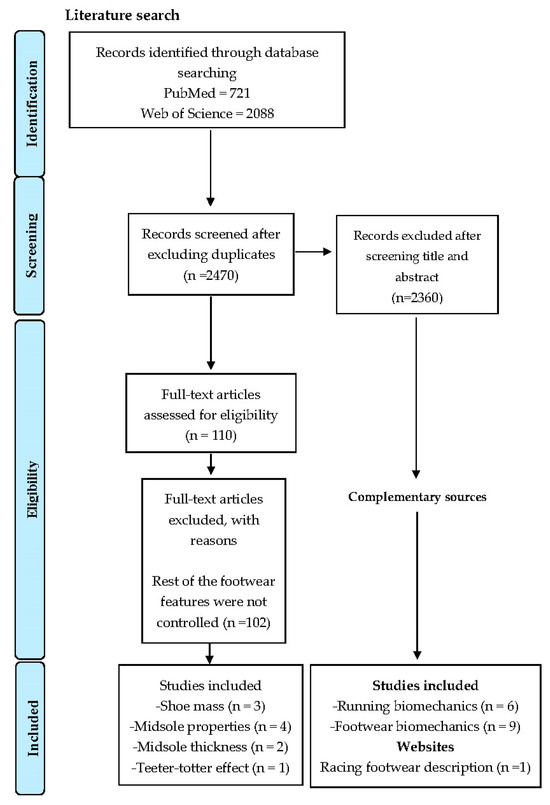 The footwear features of potential interest for this review were first identified according to an expert consensus [16]. Subsequently, these were chosen based on their potential impact on running performance [13], with specific attention to their susceptibility to being influenced by a reduction in the stack height (i.e., shoe mass, midsole properties, teeter-totter effect items). The Pubmed and Web of Science electronic databases were used to identify studies from inception to the present. Each footwear feature term was combined with different running footwear and performance terms using “AND” and “OR” commands: (Shoe* OR Footwear OR Racing Flats OR Spikes) AND (Mass OR Midsole OR Longitudinal stiffness) AND (Economy OR Energy Cost OR Time OR Race OR Speed OR Pace). After removing duplicates and irrelevant articles, those with full-text availability were screened to identify if the footwear conditions compared in a running performance outcome (i.e., running economy, time trial, time to exhaustion) were created by a stack height reduction while maintaining the rest of the footwear features similarly. If not, those studies analyzing each footwear feature in isolation while controlling potential confounders on a running performance outcome were selected (Figure 1). The evidence provided by these studies was then discussed using complementary sources (see details in each section).