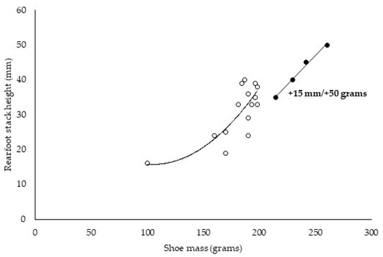 Rearfoot stack height and shoe mass relationship of the same footwear prototype [17] (Black dots: 35 mm, 214.5 g; 40 mm, 229.5 g; 45 mm, 241.5 g; 50 mm, 260.5 g) and from different racing footwear models retrieved from a specialized running footwear website [22]. White dots: Reebok Floatride Run Fast Pro (100 g, 16 mm), Nike Flyknit Racer (160 g, 24 mm), Saucony Fastwitch 9 (170 g, 19 mm), Adidas Adizero Takumi Sen 7 (170 g, 24 mm), Adidas Adizero Takumi Sen 9 (181 g, 33 mm), Nike Zoom Vaporfly 4% (184 g, 39 mm), Nike ZoomX Vaporfly Next% (187 g, 40 mm), PUMA Deviate Nitro Elite (190 g, 36 mm), ASICS MetaRacer (190 g, 24 mm), ASICS Metaspeed Edge (190 g, 29 mm), Adidas Adizero Takumi Sen 8 (193 g, 33 mm), Saucony Endorphin Pro+ (196 g, 35 mm), Nike ZoomX Vaporfly NEXT% 2 (196 g, 39 mm), ASICS Metaspeed Sky (198 g, 33 mm) and PUMA Fast FWD Nitro Elite (198 g, 38 mm).