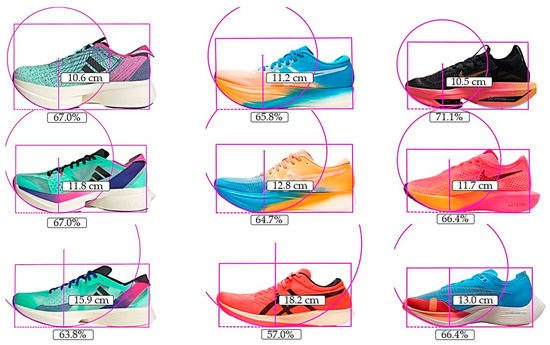 A single study was identified that analyzed the teeter-totter effect on a running performance outcome while maintaining the rest of the footwear features similarly [25]. This was performed by comparing different racing footwear models with increased longitudinal stiffness of similar weights (<30 g) [25]. In order to further illustrate the potential implication of the stack height on the teeter-totter effect, the rocker and toe spring radius, as well as the rocker axis position have been analyzed in different current racing footwear models using the Kinovea free-access software [26] (Figure 3 and Figure 4).