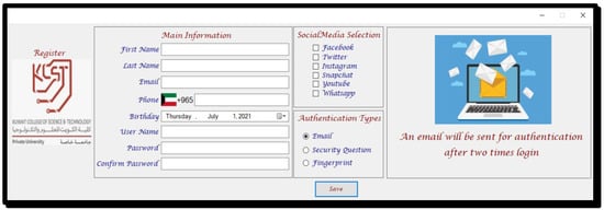 The proposed system is used to serve users of social networking platforms and provide them with the necessary security using multiple ways. As shown in Figure 1, the user fills in their data, chooses the type of protection, and finally stores it in the secure database for future use. As soon as the user saves their data, the proposed system sends a message to the user’s email and informs it to choose a username and password for future login. In addition, the user can protect their communication with social networking platforms by entering their address in the proposed system. Similarly, the unauthorized user with incorrect credentials will be denied using the social networking platform. Finally, the system components are shown in Table 1.