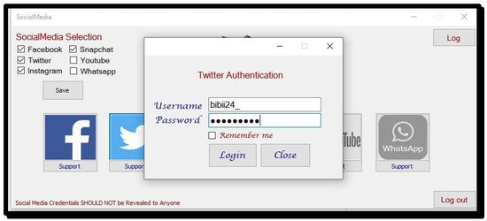 When a user clicks on the selected application, for example, Twitter, it moves to a page containing the username and password, as shown in Figure 5. The system also allows a user to remember the username and password for future use.