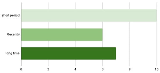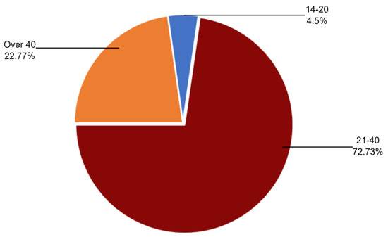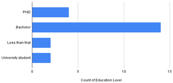 Table 3 and Figure 11 show the age group participating in the questionnaire, where 76.20% of participants’ ages range from 21 to 40. Similarly, Figure 12 shows the level of education among the participants, where the highest percentage are bachelor’s degree holders.