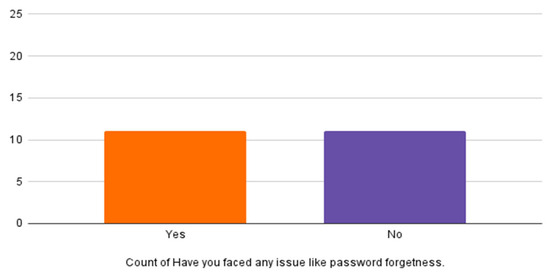 Table 4 and Figure 13 show that 61.9% of participants do not read and understand the security policies related to social media. Table 5 and Figure 14 show participants’ responses about who encounter a problem of forgetting their password, which is 52.40%.
