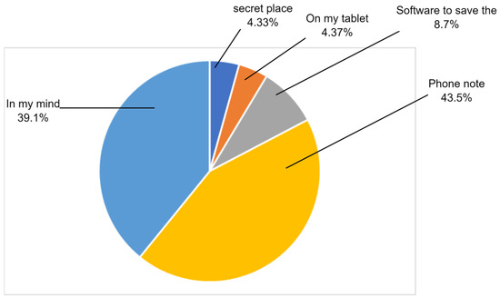 Table 6 and Figure 15 show how participants save their passwords: tablet, phone note, secret place, personal memory, or software. The majority of participants rely on phone notes and personal memory, 43.50% and 39.10%, respectively.