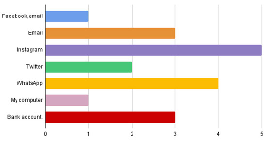 Figure 21 shows the social media accounts that are hacked: Instagram comes first, followed by WhatsApp and email.