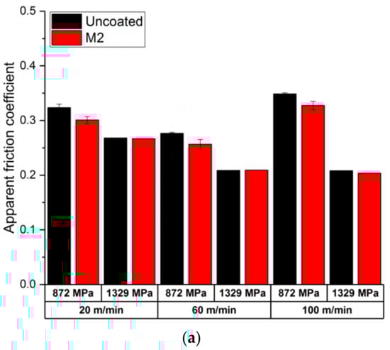 The apparent friction coefficient is strongly correlated to the sliding speed and the contact pressure. Many researchers have shown that the friction coefficient drops when increasing the sliding speed [,,,,]. Rech et al. [] conducted tribological tests on various work materials with a TiN-coated carbide tool; the friction coefficient dropped significantly with increasing sliding speeds. Similar results were obtained by other researchers for other materials and contact conditions [,,,]. Besides this, the contact pressure between the pin and workpiece is also a crucial parameter that affects the friction coefficient. Meier et al. [] tested the friction coefficient using different normal forces between 5 N and 400 N, under dry and flood conditions. Using lower loads, the friction coefficient increases with the sliding velocity. However, using higher loads, the friction coefficient decreases when the sliding speed increases.