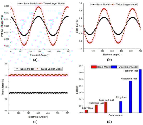 Comparison of electromagnetic parameter calculation results between two motor models under the principle of analogy: (a) permanent magnet flux linkage; (b) back electromotive force; (c) thrust force; (d) iron core loss.