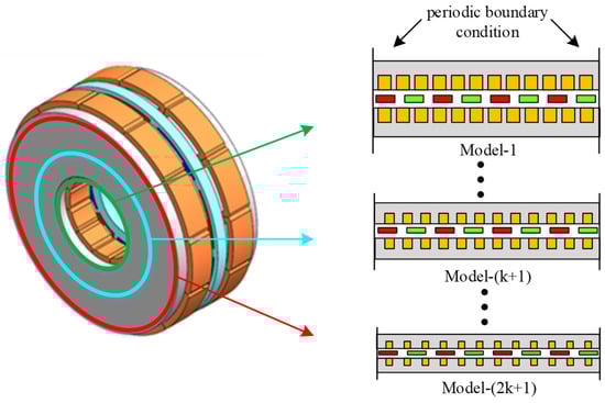After the above transformation, the three-dimensional axial flux motor is transformed into a series of two-dimensional linear motors, as shown in Figure 9. The permanent magnet width, motion speed, length of periodic boundary conditions, step size, and calculation time of all linear motors are consistent. After calculating the results, the electromagnetic calculation results of each linear motor can be obtained. By combining the principle of analogy, the axial flux motor can be estimated through the following post-processing steps.