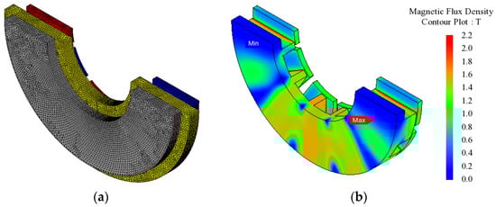 A three-dimensional model of a quarter axial flux permanent magnet synchronous motor: (a) grid partitioning result; (b) magnetic density cloud map.