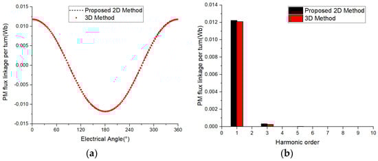 When no current is applied to the winding, the magnetic flux of the cross-linked winding is generated by permanent magnet excitation. For the design and control of permanent magnet synchronous motors, the value of the permanent magnet magnetic flux is very important. The waveform of the permanent magnet flux calculated by the 2D and 3D methods is shown in Figure 13a, which roughly appears to be almost identical. Further Fourier decomposition was performed to obtain the harmonic distribution of the two methods, as shown in Figure 13b. From the results, it can be seen that the fundamental amplitude of the permanent magnet flux is 0.01223 Wb and 0.01208 Wb, respectively, with a numerical error of only 1.23% between the two. The maximum harmonic component of the permanent magnet flux in both methods is the third harmonic, with amplitudes of 3.29801 × 10−4 and 2.54954 × 10−4 Wb, respectively. It can be seen that the third harmonic component obtained by the 2D equivalent method is relatively large, but it is still very small for the fundamental amplitude.