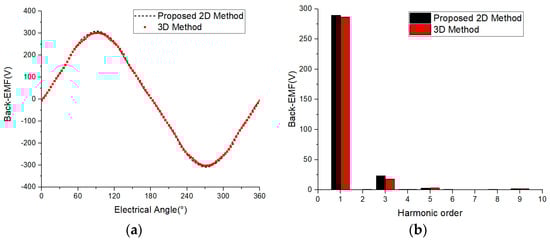 The no-load back electromotive force is the differential of the permanent magnet flux with respect to time. The waveform of the permanent magnet flux calculated by 2D and 3D methods is shown in Figure 14a, which roughly appears to be almost completely coincident, and the shape of the sine is relatively high, with only slight deviations at the peak and valley values. Further Fourier decomposition was performed to obtain the harmonic distribution of the two methods, as shown in Figure 14b. From the results, it can be seen that the fundamental amplitudes of the no-load back electromotive force are 289.07568 V and 286.13794 V, respectively, with a numerical error of only 1.01% between the two. The maximum harmonic component of the no-load back EMF in both methods is the third harmonic, with amplitudes of 23.35874 V and 17.99104 V, respectively. It can be seen that the third harmonic component obtained by the 2D equivalent method is relatively large, but it is still very small for the fundamental amplitude. The THD values of the two are 8.15% and 7.05%, respectively, indicating a small difference in the sine degree of the motor’s back electromotive force.