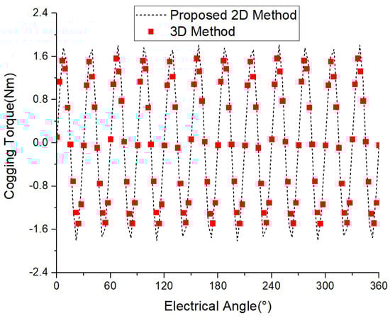 The positioning torque is generated by the interaction between the permanent magnet magnetomotive force and the changes in air gap permeability caused by slotting and is also one of the sources of torque pulsation and noise in the practical application of electric motors. The waveform of the permanent magnet flux chain calculated by the 2D and 3D methods is shown in Figure 15, which roughly appears to be almost completely coincident with each other, presenting a form of 12th harmonic within an electrical cycle. The positioning torque amplitudes obtained by the two methods are 1.71 Nm and 1.59 Nm, respectively, with a numerical error of only 7.01% between the two. It can be seen that the value of the positioning torque obtained by the 2D equivalent method is relatively large, but the error meets the engineering requirements in the preliminary design and optimization.
