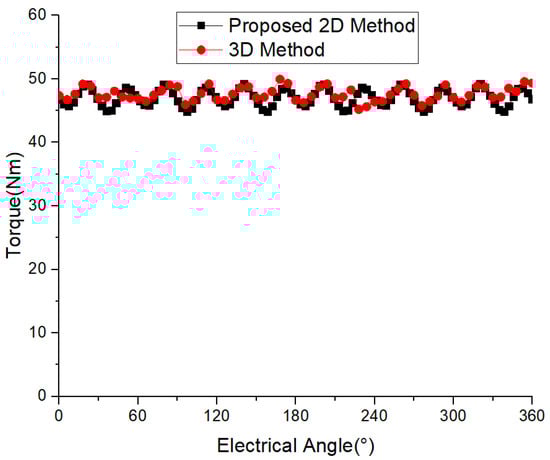 Axial flux motors are used to drive loads for various rotational movements, so electromagnetic torque must be calculated in engineering design. The waveform of the electromagnetic torque calculated by the 2D and 3D methods is shown in Figure 16, which roughly appears to be almost completely coincident, exhibiting a 12th harmonic within an electrical cycle. The electromagnetic torque amplitudes obtained by the two methods are 47.85 Nm and 47.63 Nm, respectively, with a numerical error of only 1.2% between the two. For torque fluctuation, the fluctuation value calculated by 2D is 4.85 Nm, with a fluctuation ratio of 9.24%, and the fluctuation value calculated by 3D is 4.72 Nm, with a fluctuation ratio of 9.90%. The calculation results of the two methods are very close, and the error meets the engineering requirements in preliminary design and optimization.