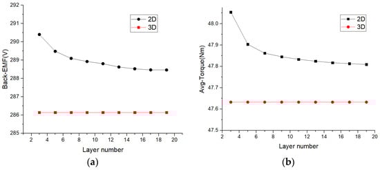 In order to supplement the analysis of the impact of the number of layers on the proposed method, a calculation model for dividing the method from 3 layers to 19 layers is established. The average radius under different dividing methods is shown in Table 4, and the results are organized and analyzed using the aforementioned method. Taking the amplitude of the fundamental wave of the back electromotive force and the average electromagnetic torque as examples, the results are shown in Figure 17. It can be seen that as the number of layers increases, the calculation results of the 2D method are closer to those of the 3D method; that is, the more layers there are, the more accurate the calculation results are. In the current example size, when the number of layers exceeds nine, the impact of the number of layers is not significant. Therefore, in the subsequent practical application process, it is necessary to select the appropriate number of layers based on the actual size and accuracy requirements of the calculation model. It should be noted that due to the inability of the 2D method to consider the impact of end leakage flux on axial flux permanent magnet synchronous motors, the calculation errors caused by these factors cannot be solved by increasing the number of layers. One of our future key tasks is to quickly and accurately consider the impact of magnetic flux leakage at the end of this three-dimensional model.