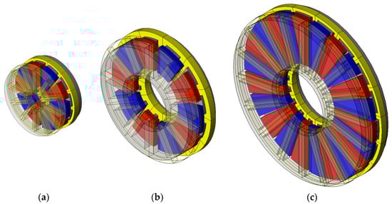 To further validate the effectiveness of the equivalent calculation method proposed in this article, two models of axial flux permanent magnet synchronous motors were randomly added, as shown in Figure 18, and their electromagnetic performance was sequentially calculated using the layered equivalent calculation method. Among them, Motor 1 has a smaller size in the radius direction, a smaller pole arc coefficient, and a higher speed. Motor 2 is the model used for the detailed analysis mentioned earlier, while Motor 3 has a larger radius, a larger pole arc coefficient, and a higher speed. The specific model dimensions and calculation results are shown in Table 5.