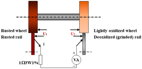 Finally, the device was adapted to perform contact resistance measurements at both wheel–rail contacts using the four-probe method. The rails were electrically insulated from the frame by interposing a Kapton film. For each side, current supply and voltage measurements were performed using copper brushes pressed against the inside of the wheel and rail, as schematically shown in Figure 2. For the experiments reported in this paper, we used a low-frequency generator associated with a voltage supply (20 V max). Current intensity was determined through the measurement of the voltage drop at a 1 Ω resistor terminals; its maximum value was about 6 A.