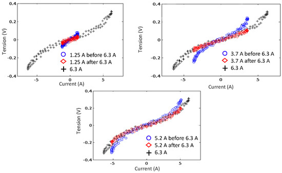 Comparison of voltage–current characteristics (over a few periods) measured before and after a sequence at maximum intensity of 6.3 A, for three different current values (signal frequency: 2300 Hz).