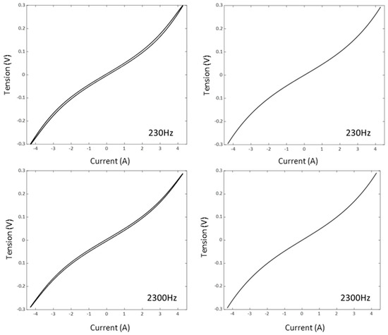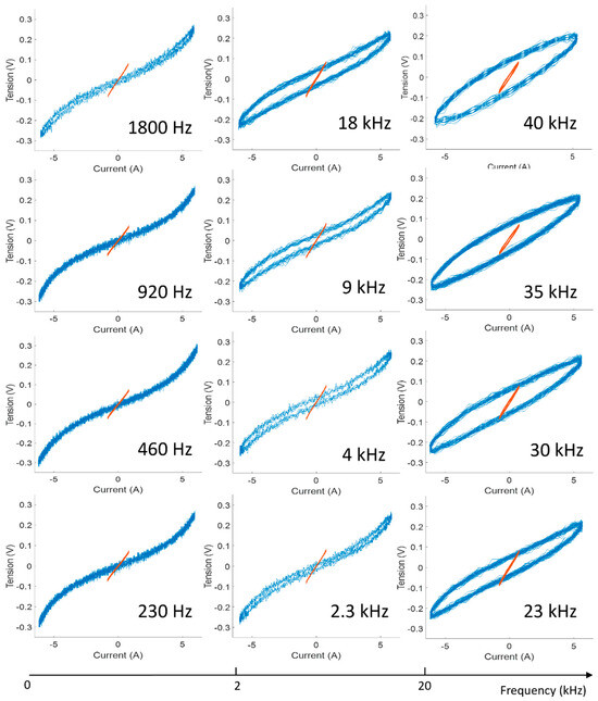 To study the influence of the frequency, we chose to consider two current values: one below 1 A, leading to nearly ohmic characteristics (800 mA), and the other above 1 A, to observe nonlinear behaviours (6 A). Three frequency intervals were chosen: 230 Hz–1.8 kHz, 2.3 kHz–18 kHz, and 23 kHz–40 kHz, with four frequency values considered in each. The results of these tests are presented in Figure 4 and Figure 5. In the first case (Imax = 800 mA), the characteristics are quasilinear, with identical slopes for 230 Hz and 2.3 kHz, and then hysteresis starts to appear for 23 kHz, with the average slope remaining approximately the same. In the second case (Imax = 6 A), the characteristics are clearly nonlinear. Quasi-superimposable up to 9 kHz; they then show an increasingly pronounced hysteresis as the frequency increases. At the highest frequencies, the tension–current characteristic evolves towards a shape close to an ellipse, together with a slight decrease in the maximum voltage.