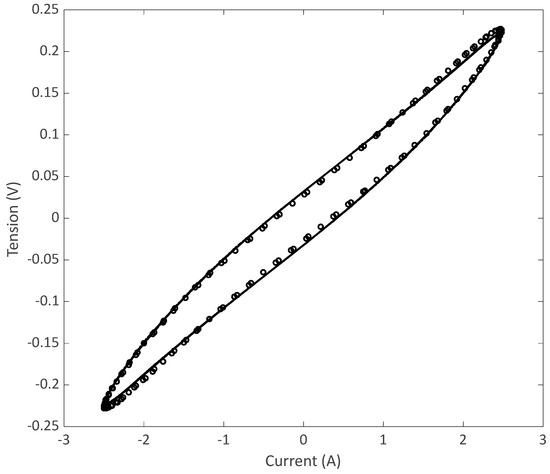 Interestingly, the nonlinear behaviour and hysteresis phenomenon observed at a reduced scale, as shown in Section 2 (Figure 5), were also witnessed in the railway site tests under real conditions, as one can see in Figure 6 and Figure 7. One can note that the nonlinearity is slightly less pronounced compared to the 6 A curves pictured in Figure 5, since the track circuit only allowed a current of 2 A to flow. The voltage current characteristics in this real case are therefore in between those obtained with the laboratory bench. Consequently, it was deemed interesting to investigate which behavioural law could fit those data to serve as a model for railway engineers.