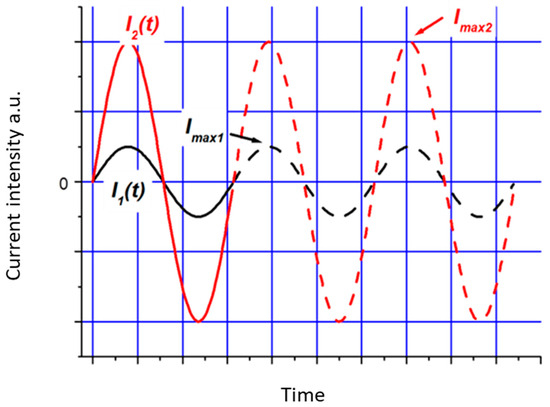 Schematic representation of the two cases studied: I1(t): current wave with a “low” maximum value; I2(t): current wave with a “high” maximum value. In both cases, the first period is shown as a solid line and the following periods are shown as dashed lines.