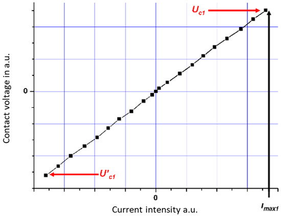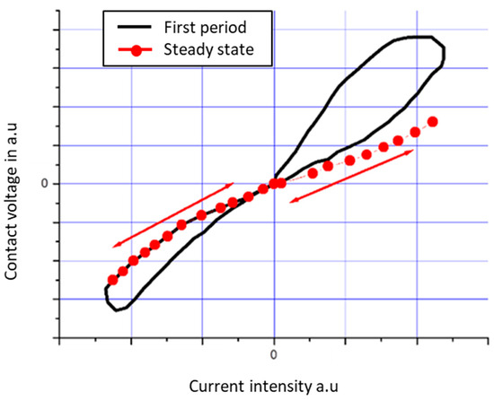 In this case, we plotted the contact voltage in arbitrary units against the instantaneous value of the current, as shown in Figure 9. This curve is valid both for the first current period and during the steady state (i.e., the following periods). An increase in voltage corresponding to a “high” contact resistance is observed, which is independent of the current value. The curve is approximately symmetrical: the maximum values of the voltages Uc1 and U’c1 seem to be opposite to one another. The current flow does not seem to have any influence on the contact resistance (i.e., on the size and nature of the contact area).