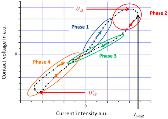 In Figure 10, we have plotted the contact voltage (in arbitrary units) as a function of the instantaneous value of the current intensity (also in a.u.) during the first current period. Several phases can be seen on this U(I) curve:
