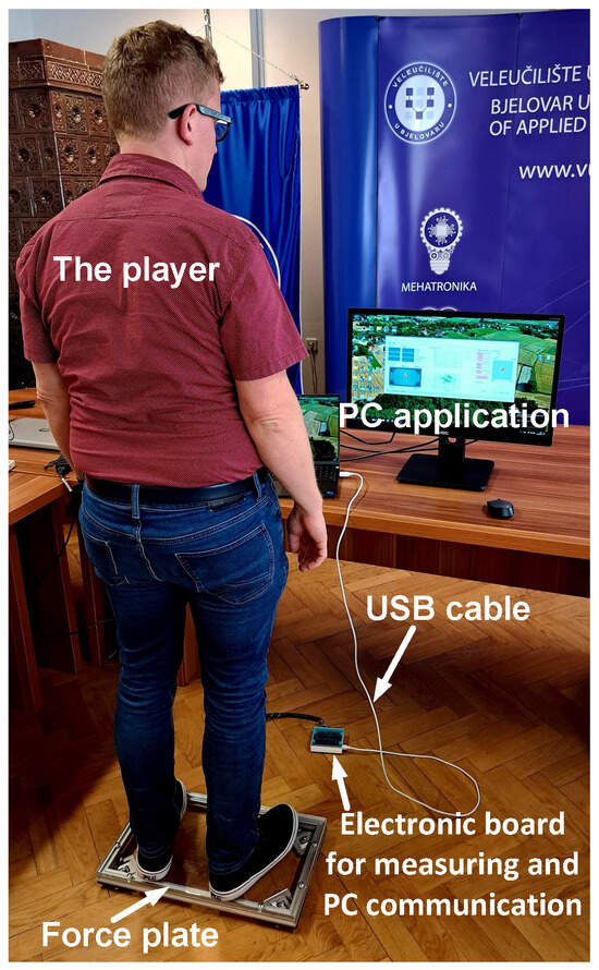 After the system is calibrated, it is ready to be used to control games. During the game, the PC application calculates the position of the human body’s CoP and acceleration of the CoM along the z axis. Based on the calculated values, it simulates pressing the UP, DOWN, LEFT, RIGHT, and SPACE keyboard keys or movements of the cursor and clicking the left mouse button. This is what enables controlling games using the player’s CoP and the acceleration of the player’s CoM along the z axis. The developed and constructed prototype of the system for game control based on a force plate with a player is shown in Figure 2. The image shows all the described parts of the system.