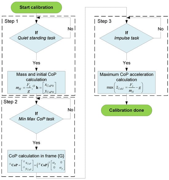 The calibration procedure is conducted in three steps. In the first step of the calibration (Step 1 in Figure 4), the player standing on the force plate must maintain an upright and still standing during the ground reaction force measurements. After 20 s, measuring is complete, and the player’s mass is calculated according to Equation (7) ( 0 m/s):
