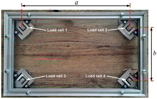 The force plate in Figure 6 is made according to the designed CAD model. The force plate frame is made of aluminum angles (20 × 20 mm) with a 10 mm thick acrylic sheet attached to it. The force plate dimensions are 480 × 280 × 45 mm. Using angles, the load cells are secured to the corners of the aluminum frame. The distance between the load cells along the x axis is a = 388 mm, and along the y axis, it is b = 188 mm. Figure 7 shows the bottom side of the force plate, where legs adjustable for height are visible and which are used as a basis for the force plate.