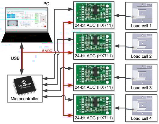 The electronic architecture of the system for game control is shown in Figure 8. It consists of an ATmega32U4 microcontroller with necessary periphery components, four analog-digital (AD) HX711 transformers, four load cells, and a PC with an application for data acquisition, system calibration, and game control.