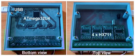 The electronic board for measuring and PC communication is shown in Figure 9. The ATmega32U4 microcontroller is connected to the PC via a USB connection. The power supply is secured through a USB connection with the PC. Force measurements are conducted by using the load cells (part number L6P-C3-45kg), which generate a voltage proportional to the measured force [21]. The generated voltage is sampled with a 10 Hz frequency using an HX711 AD converter and is then amplified 128 times and converted into a digital word.