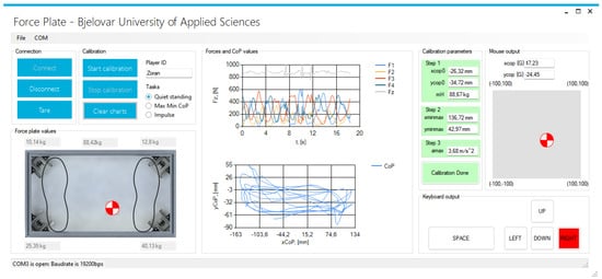 The PC application for data acquisition, system calibration, and game control is shown in Figure 10, and it was built in the .NET framework and written in C#. The application uses USB communication to fetch the force measurements from the force plates via the ATmega32U4 microcontroller. The app uses the measured forces to calculate and present the player’s CoP in the various frames. The calibration process of the system shown in Figure 4 is performed by the application. Each new system calibration step is started with the “Start calibration” button. While running the calibration steps, the app stores the measured forces in a textual file so that the data can be processed later. Each calibration step can be repeated multiple times. After the system calibration is completed, the player standing on the force plate can change his or her CoM to simulate pressing the UP, DOWN, RIGHT, LEFT, and SPACE keyboard keys or mouse cursor movement or clicking the left mouse button, all with the purpose of controlling the game. The application enables the display of the simulation of pressing each individual key, which is accomplished by changing the color of the key in the user interface to red. The purpose of the application is the validation of the game control system. The system calibration, player CoP calculation, the calculation of the acceleration of the player CoM along the z axis, and simulating pressing keyboard buttons and moving the mouse cursor can also be carried out via the ATmega32U4 microcontroller after the system validation is conducted.