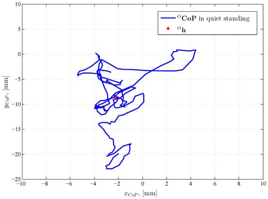 The player stood with both of his feet on the force plate (see Figure 2) and was asked to stand quiet and upright for the next 20 s during the first step of the system calibration procedure. Figure 11 shows the player’s CoP measurement in frame {O} during quiet and upright standing.