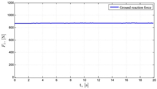 The blue color shows the graph of the player’s CoP position during such standing in frame {O}. The red pluses show the average value of the player’s CoP (i.e., the position vector calculated based on Equation (9)). The components for the position vector were = −2.21 mm and = −8.73 mm. Figure 12 shows the ground reaction force measurement in frame {O} during quiet and upright standing. The average value of the ground reaction force on the graph was 871.23 N. According to the relation in Equation (8), the player’s mass was = 88.81 kg. The components of the position vector and the player mass were the results of the first step of the calibration procedure for the game control system.