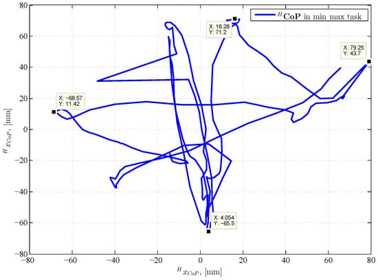 While conducting the second system calibration step, the player was asked to move his body’s CoM during a 20 s period so as to reach the maximum CoP deviations along the x and y axes. The goal of this step was to find the player’s work plane. The searching for the player’s work plane is shown in Figure 13. The graph showing the CoP position in the local frame {H} shows the following parameters: = 79.25 mm, = 68.57 mm, = 71.20 mm, and = 65.50 mm.