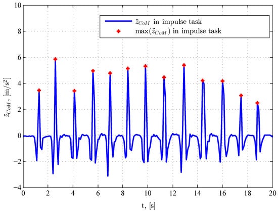 In the third step of the calibration (Step 3 in Figure 4), the player performs impulse half squats on the force plate during 20 s. For each detected half squat, a maximum of the acceleration function of the player’s CoM along the z axis is determined. The acceleration function is calculated from Equation (7) by dividing the whole equation by . The result of the third calibration step is a number of local maximums of the CoM acceleration function along the z axis, with which we can determine the threshold for pressing the SPACE key or clicking the left mouse button.