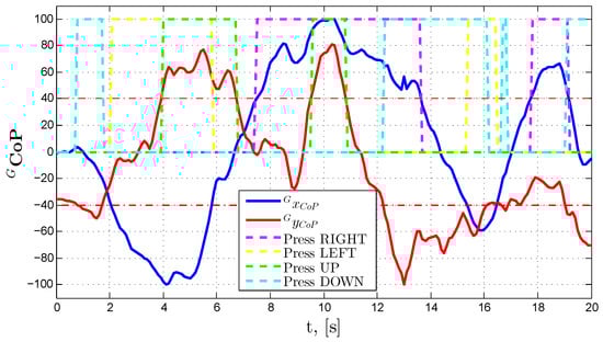 After the game control system was calibrated, it was ready to be used for testing. For the purpose of system testing, the following thresholds were used from Table 1 and Table 2: , = 40, and = 4.35. The and thresholds were determined empirically (by conducing experiments), while the threshold was the mean value of all the acceleration maximums found in the third calibration step. Figure 15 shows the simulation of pressing the RIGHT, LEFT, UP, and DOWN keyboard keys. Of note is that the player’s CoP in the local frame {G} was in the [−100, 100] range. The graph in Figure 15 shows that when , pressing the UP key was simulated. If , then pressing the DOWN button was simulated. This test shows that the system for game control correctly simulated pressing the RIGHT, LEFT, UP, and DOWN keyboard keys according to the conditions in Table 1.