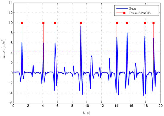 In the third step of the system calibration procedure, the player was asked to perform impulse half squats on the force plate for 20 s. Figure 14 shows the player’s CoM acceleration measurements along the z axis during the performance of the impulse half squats. The blue color on the graph represents the player’s CoM acceleration along the z axis (), while the red pluses show the maximum values of the player’s CoM acceleration along the z axis () while performing the impulse half squats. The graph in Figure 14 shows the following values: The lowest local acceleration maximum value was = 2.47 m/s, while the global acceleration maximum value was = 5.84 m/s. The mean value of all acceleration maximums amaxi was 4.35 m/s, and the median was 4.46 m/s. The result of the third calibration step was determining the threshold for initiating the simulation of pressing the SPACE key or clicking the left mouse button.